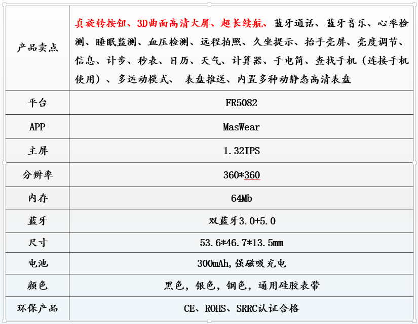 真旋转按钮、3D曲面高清大屏、超长续航、蓝牙通话、蓝牙音乐、心率检测、睡眠监测、...